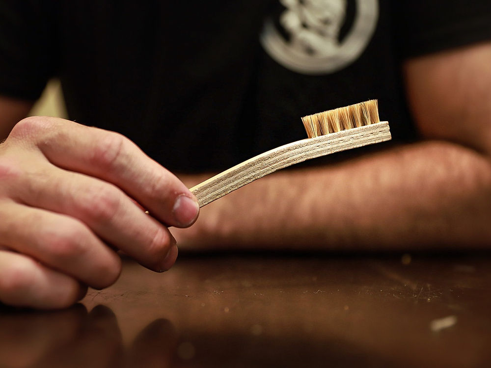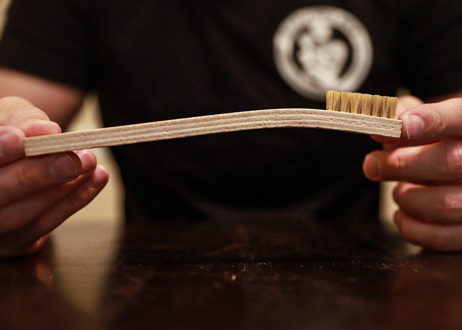 Our hog hair brush consists of a wooden handle made from plywood and hog hair bristles. The brush is 7 3/4" long with 7/16" long bristles.