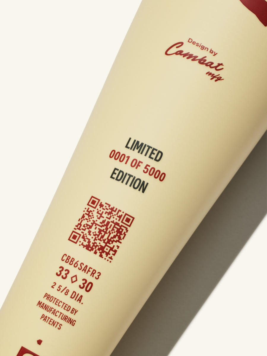 We made 5,000 individually numbered units of this cream-and-burgandy design with "Not My First Rodeo" on the barrel. With a look and feel that evokes the rugged performance of cowboy culture, this SPEC-A1 blends two icons of Americana — baseball and rodeo — in a design that commands attention in the box.