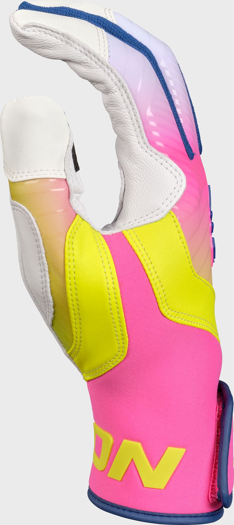 Take your game to a new level with these Walk-Off Ethos batting gloves! These gloves feature a stylish, eye-catching Sugar Rush design so you'll stand out at the plate every at-bat. Equipped with improved features like a durable goatskin palm, comfortable Lycra back, and a touchscreen compatible thumb these batting gloves are a step above the rest!