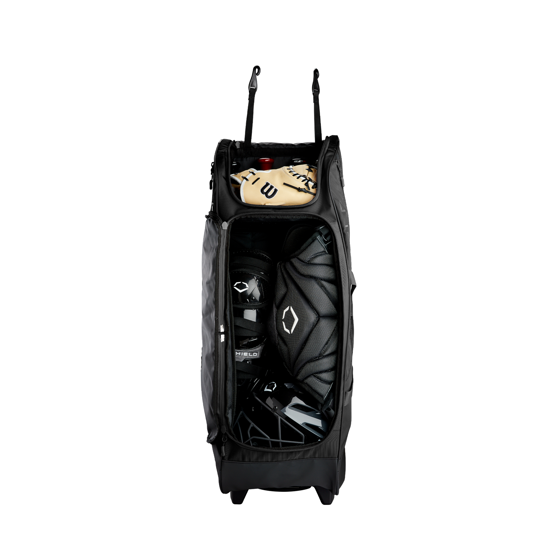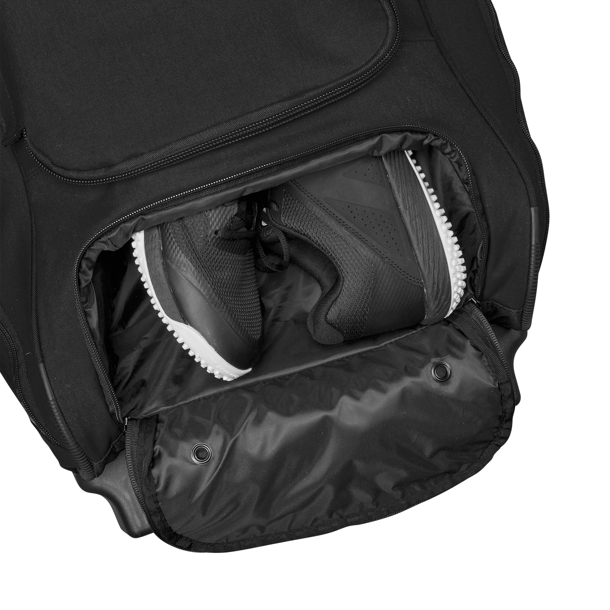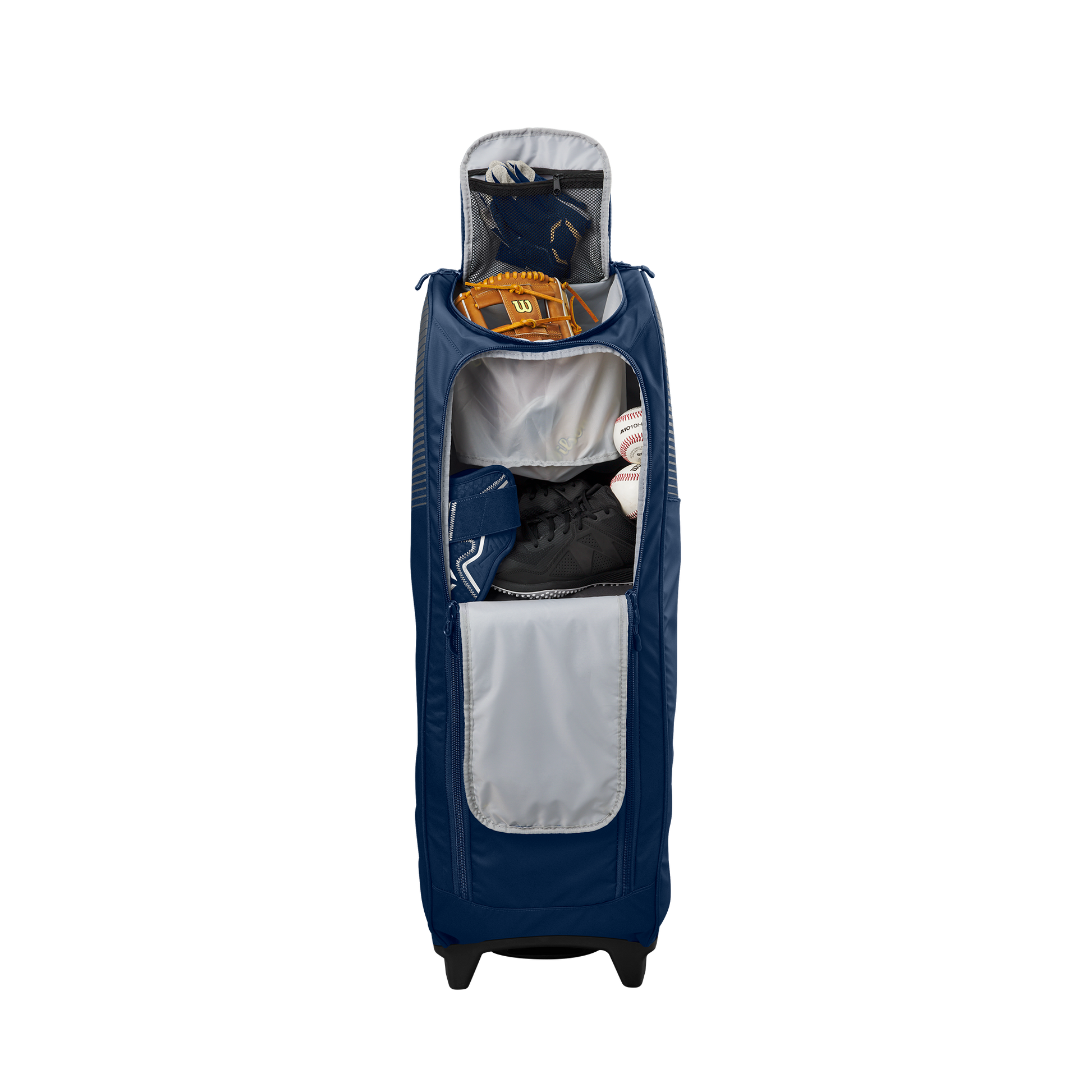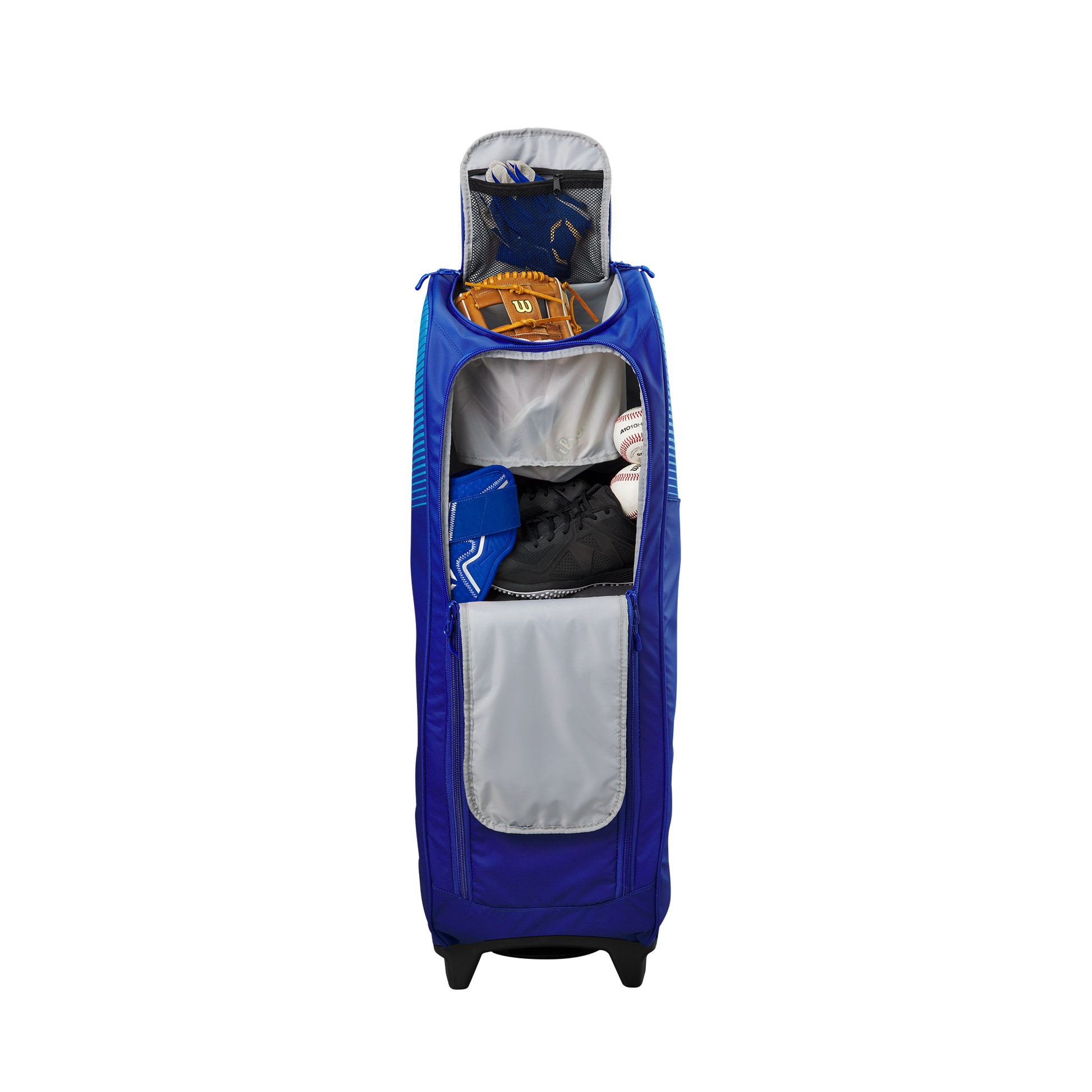 Wheeled bag with massive main compartment and four bat sleeves to keep players and coaches prepared.