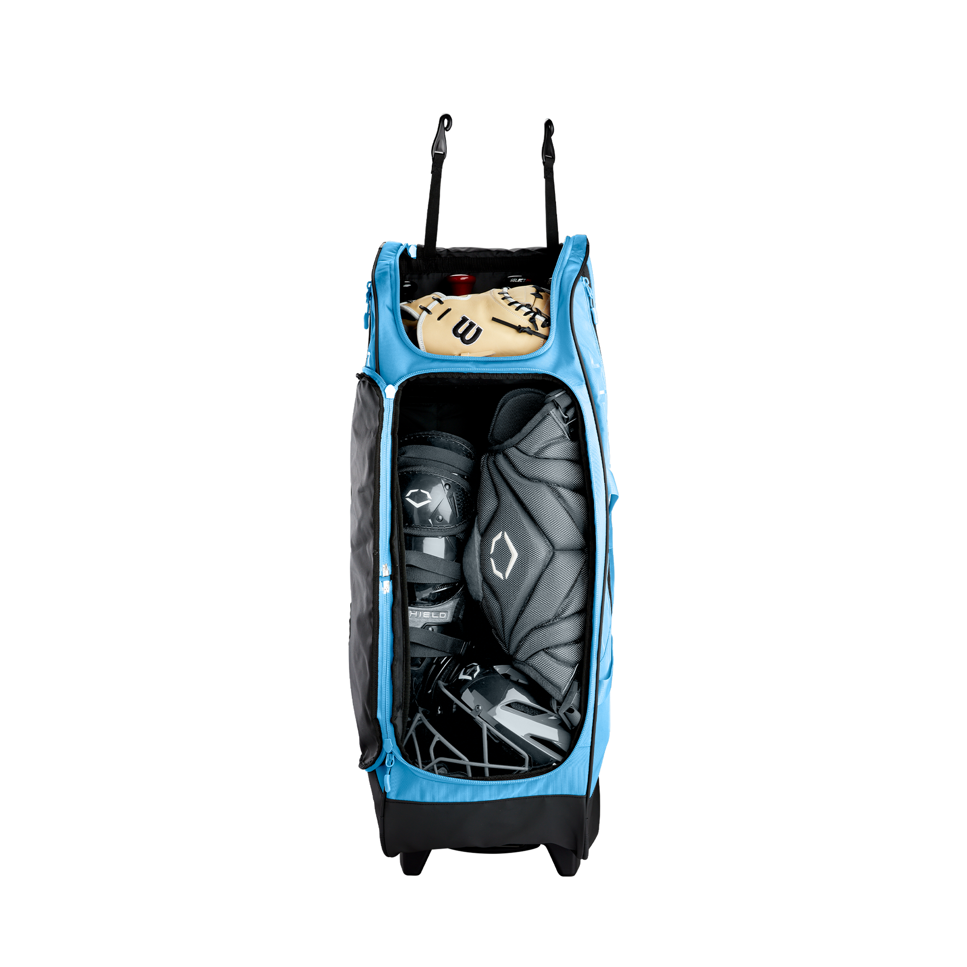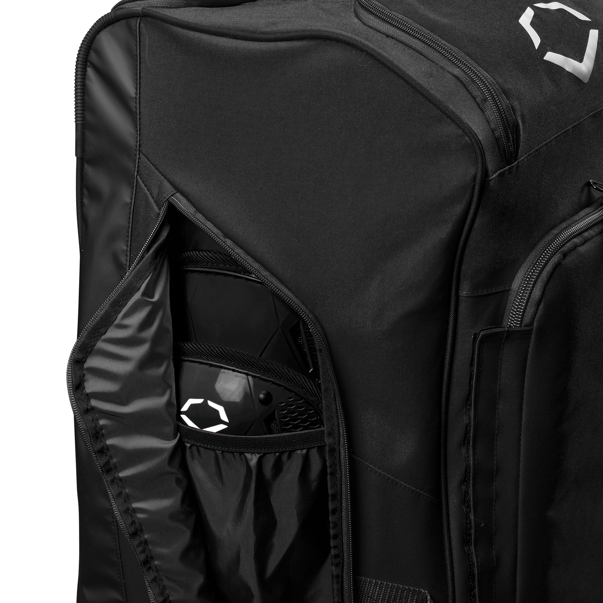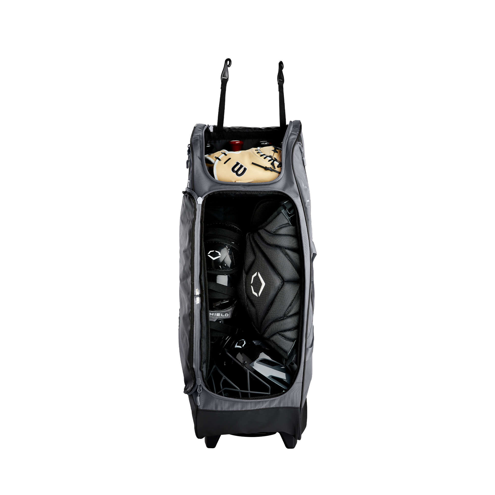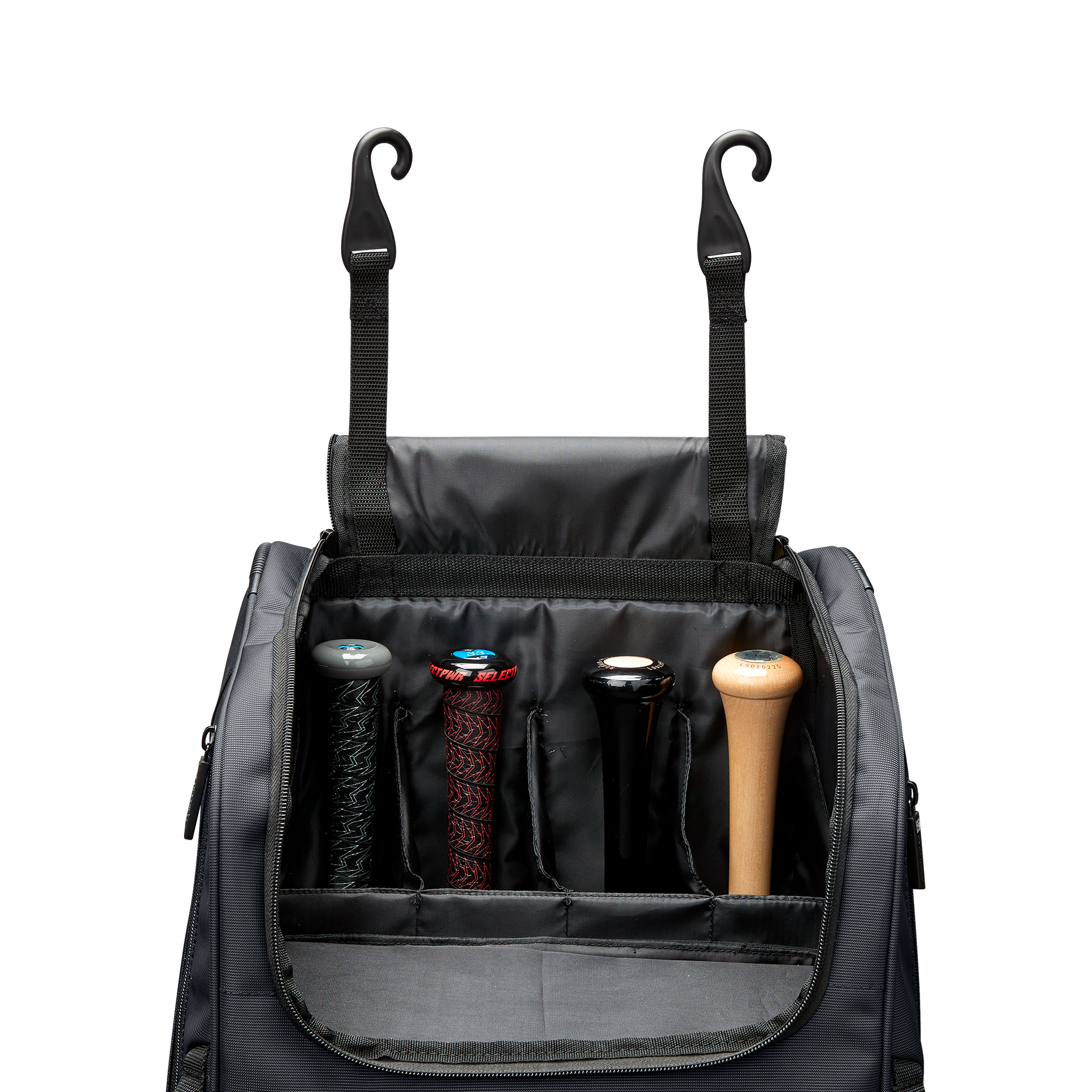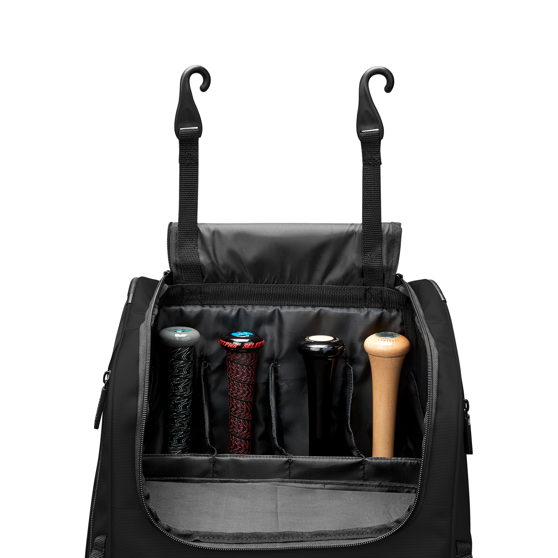Wheeled bag with massive main compartment and four bat sleeves to keep players and coaches prepared.