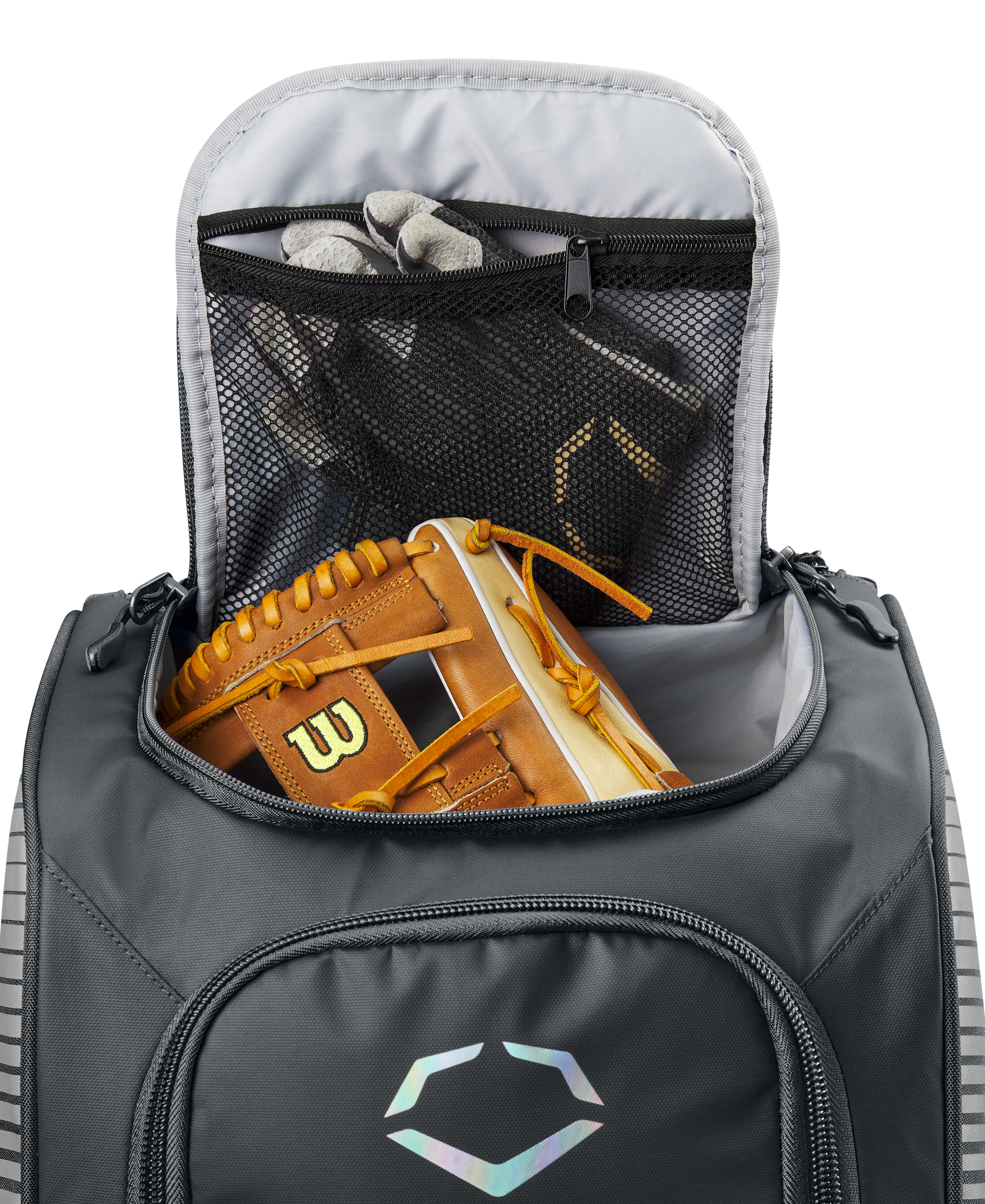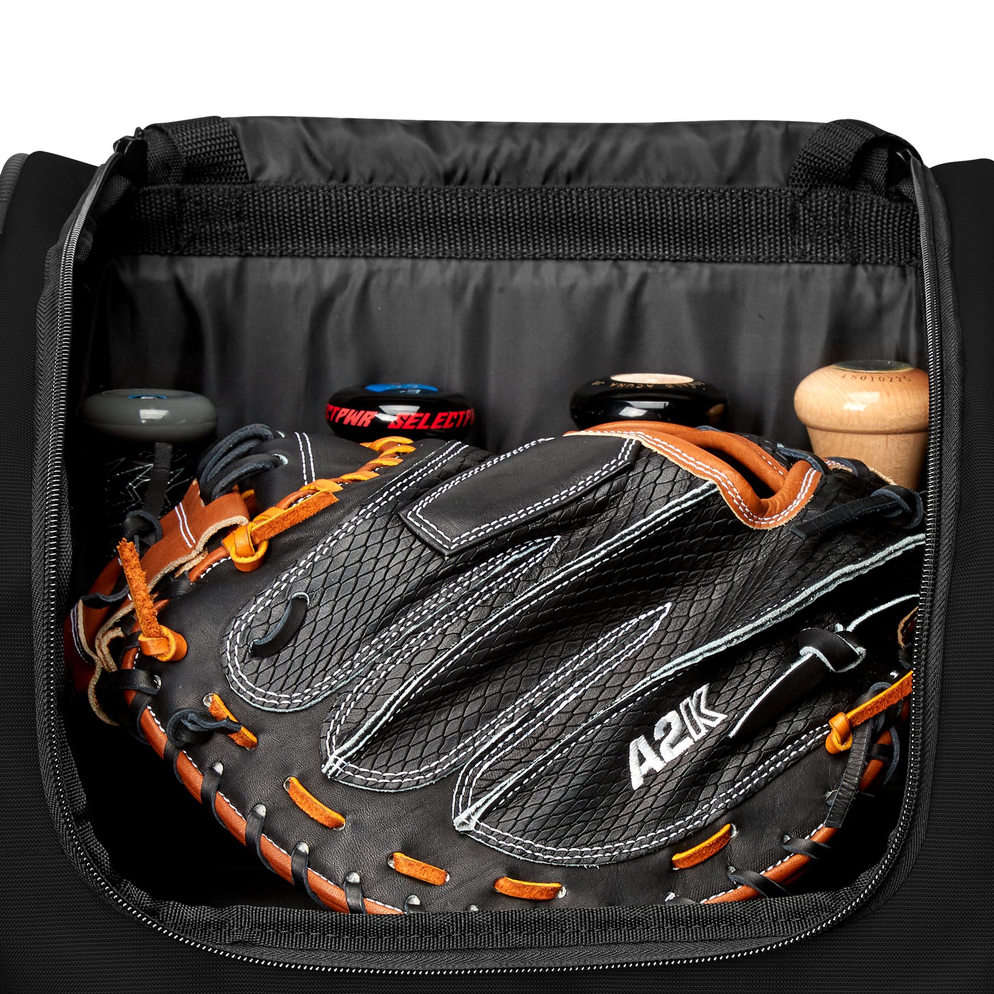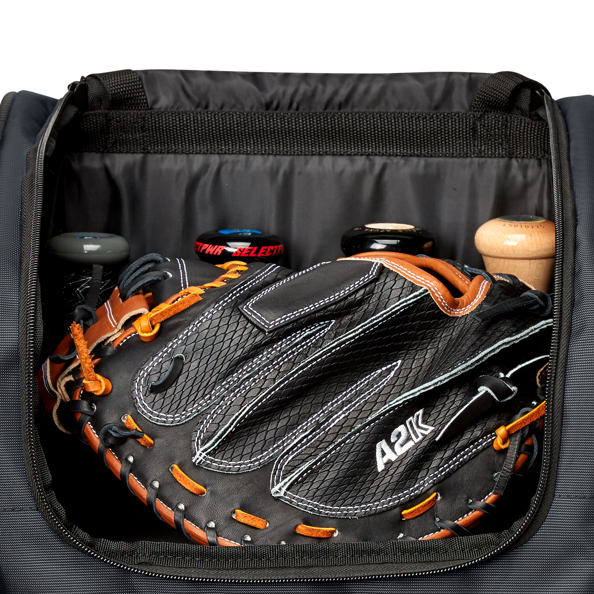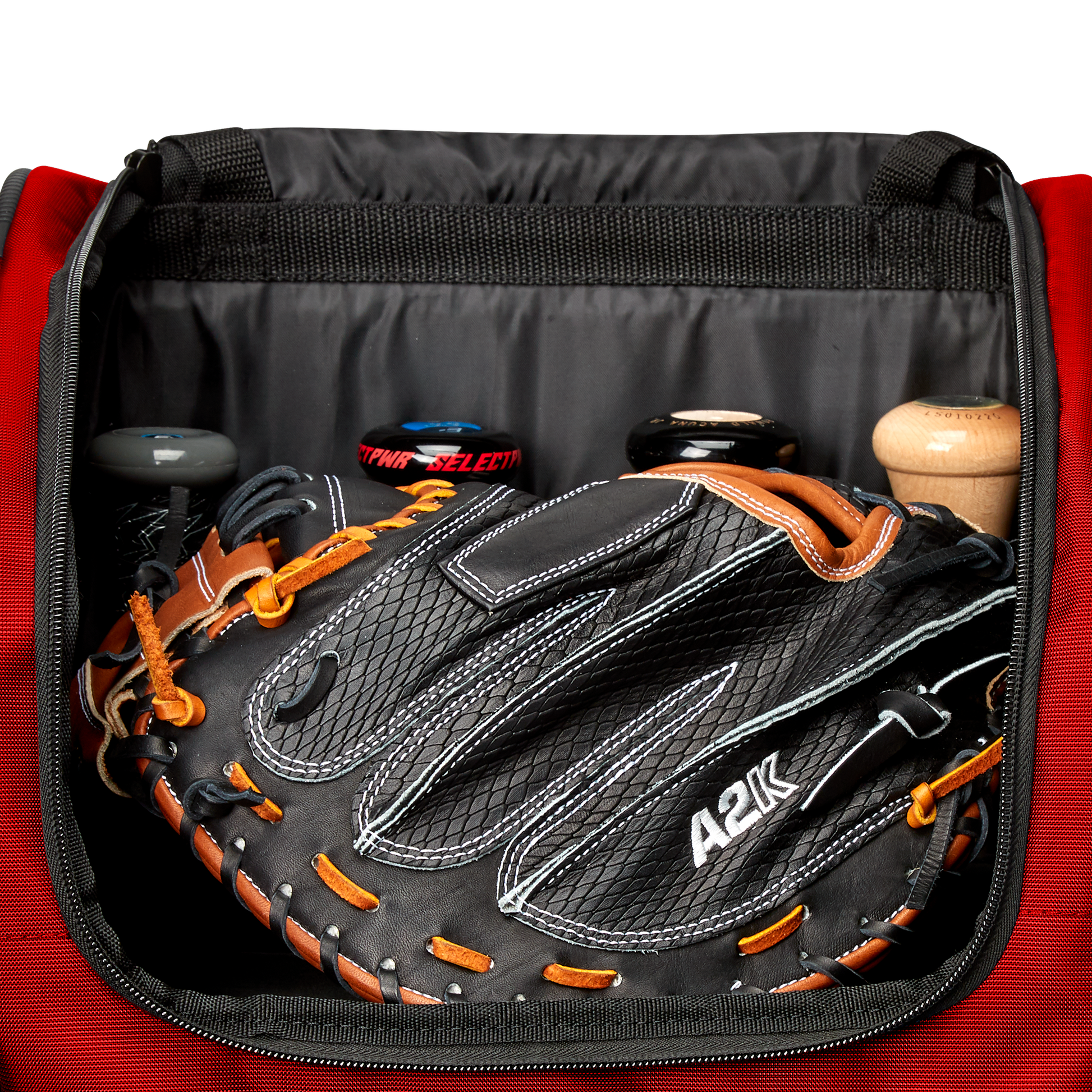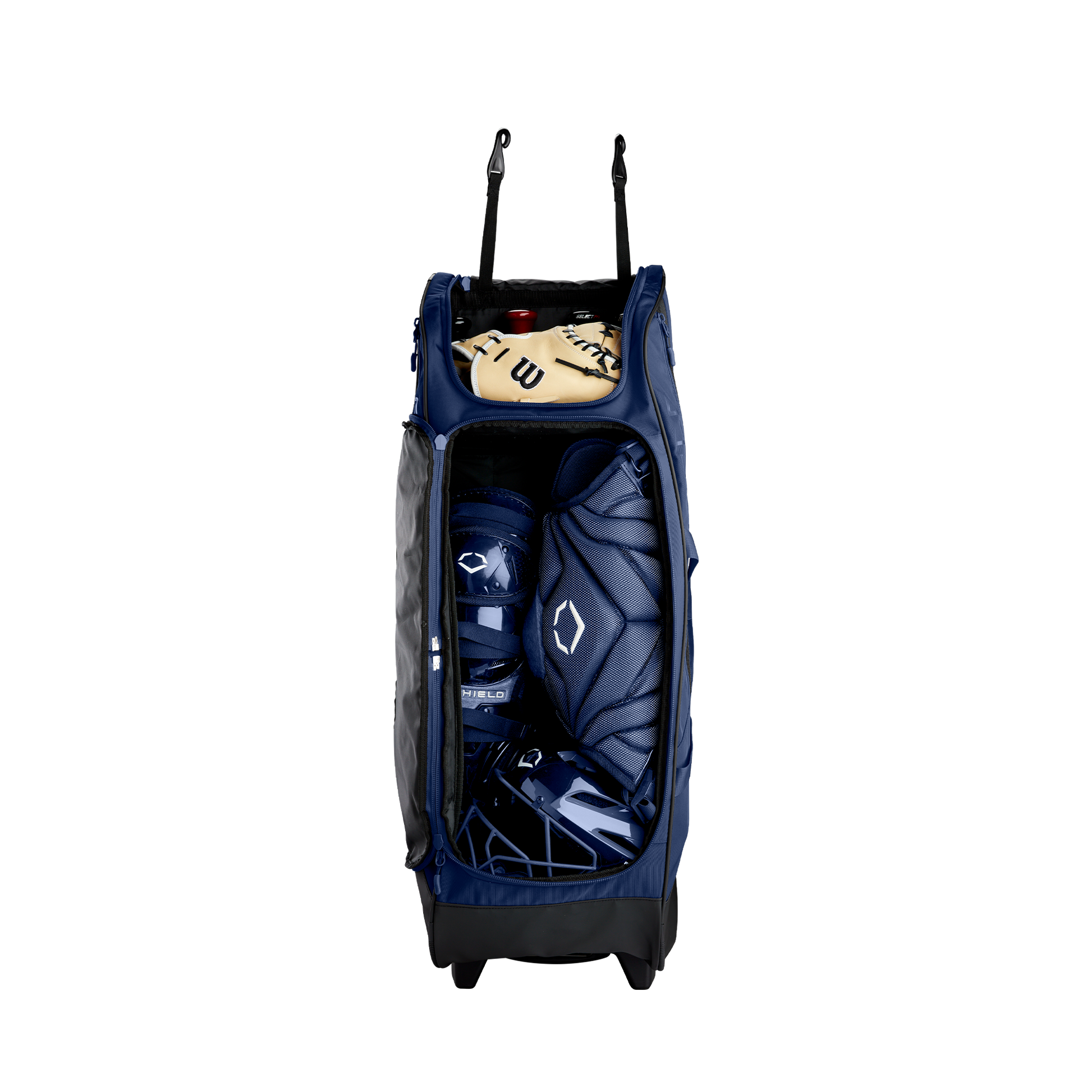 Wheeled bag with massive main compartment and four bat sleeves to keep players and coaches prepared.