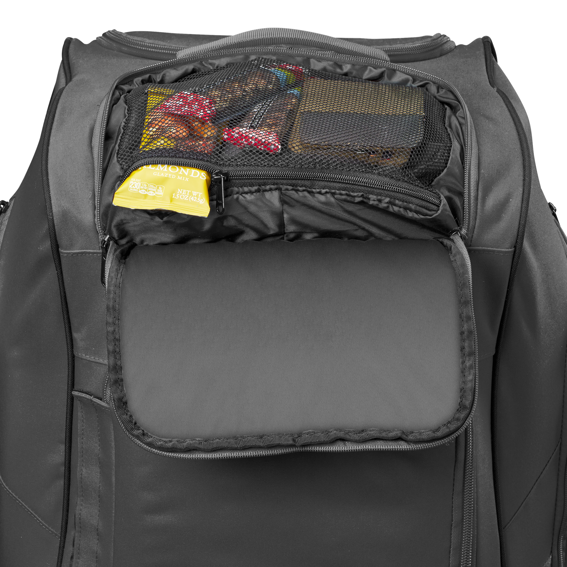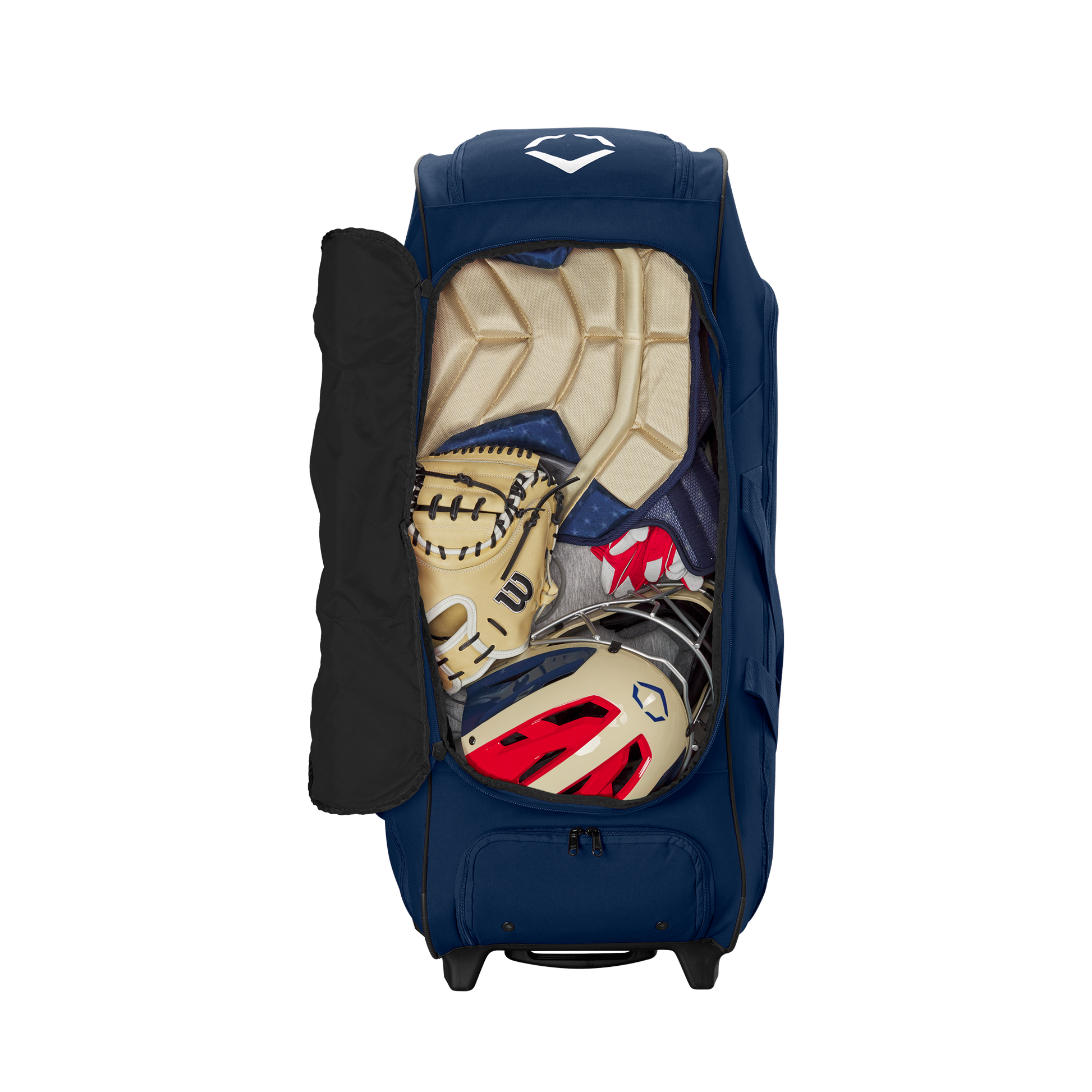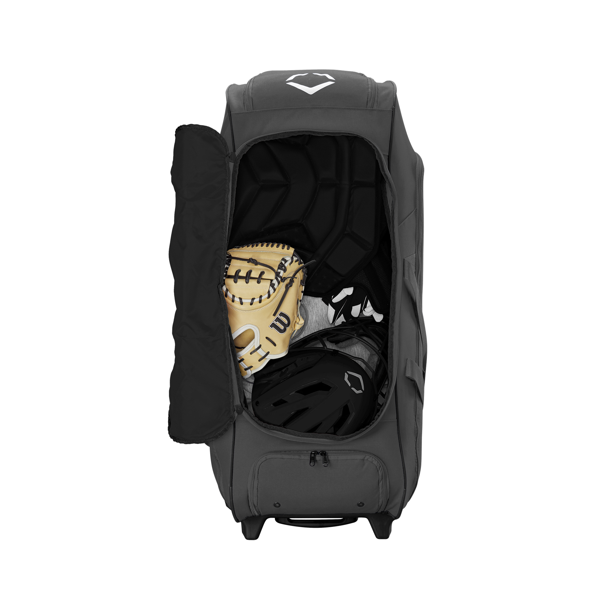 Stash all the gear your squad needs on game day with the Takeover Wheeled Bag, equipped with a massive main compartment that hits batting helmets, fielding gloves, cleats, catchers gear and more for easy transportation to the field. The 38”x14”x14” bag features a wheel chassis with 3” clearance, making it easy to roll up to the field. Four padded bat sleeves keep your bat collection organized, and a reinforced internal shelf makes it easy to sort your gear.