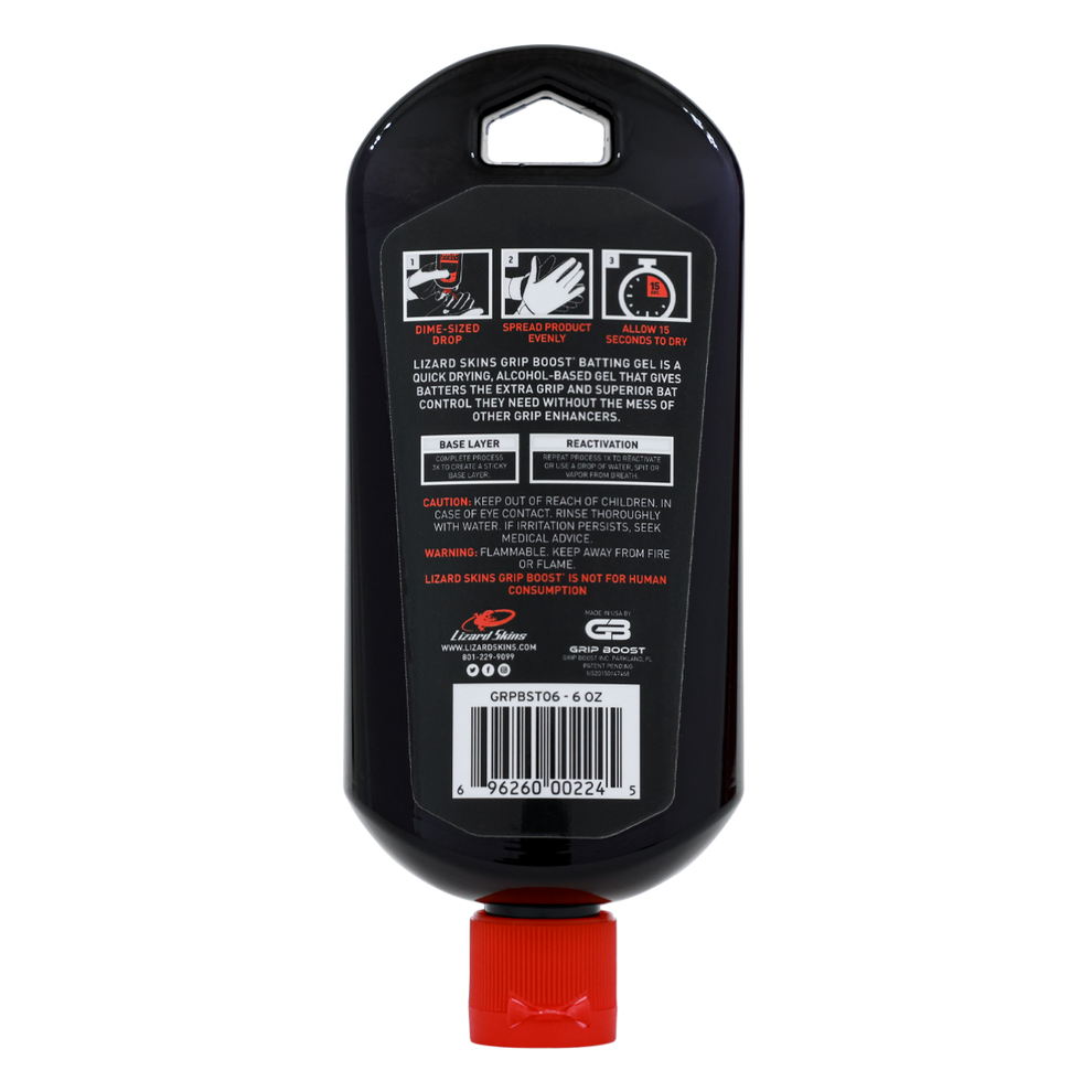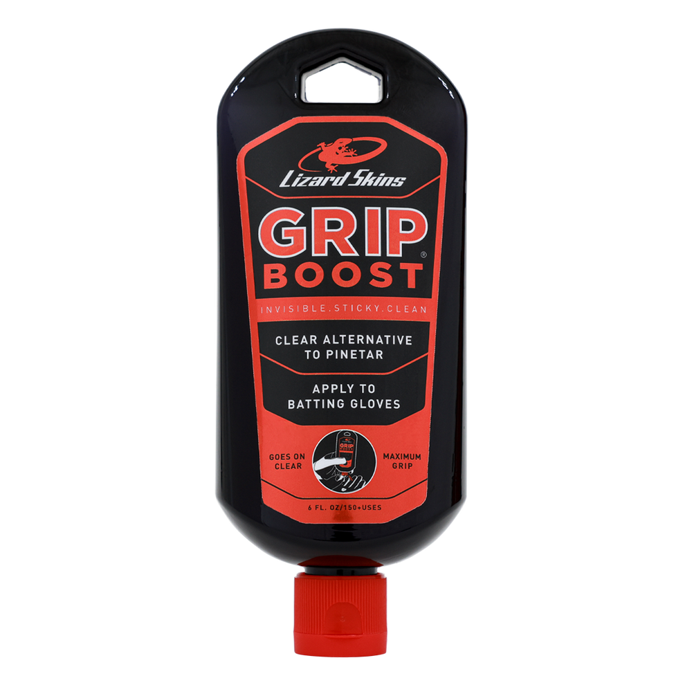 Now in a larger 6 oz. bottle!  Lizard Skins Grip Boost® batting gel is a quick drying, alcohol-based gel that gives batters the extra grip and superior bat control they need without the mess of other grip enhancers. It works by applying a thin tacky polymer layer to the palm of the glove. It’s clear, easy to clean and doesn’t leave any residue. Performance is not dependent on temperature and the tackiness can be reactivated by moisture.