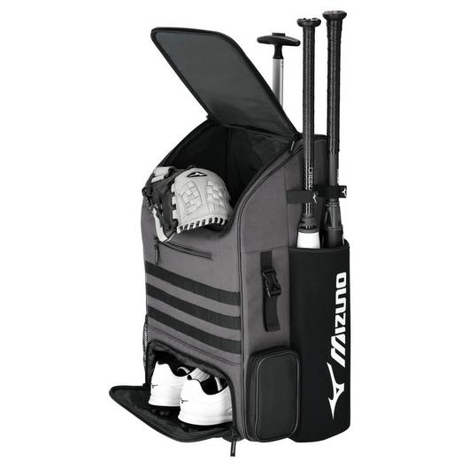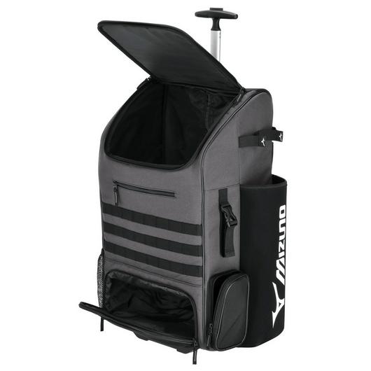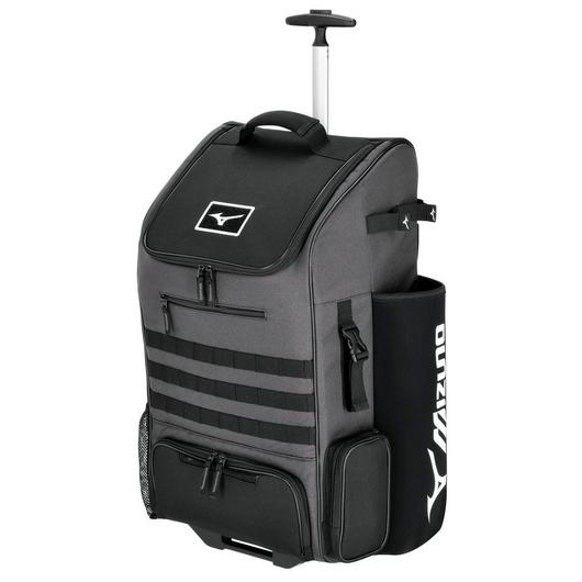 Elevate your game with the NEW Mizuno Pro Wheel Batpack, the ideal companion for baseball and softball players. This well-designed batpack offers features that make your time on the field more convenient. Safeguard your valuables, stay organized with the spacious main compartment, and carry up to four bats. With heavy-duty wheels and a telescopic handle, you can easily transport your gear, while a ventilated cleat compartment keeps your cleats fresh. Use the exterior loop buckle for securing your glove or helmet. The Mizuno Batpack ensures you're always ready to excel on the field.