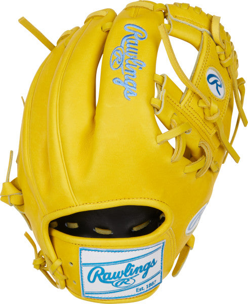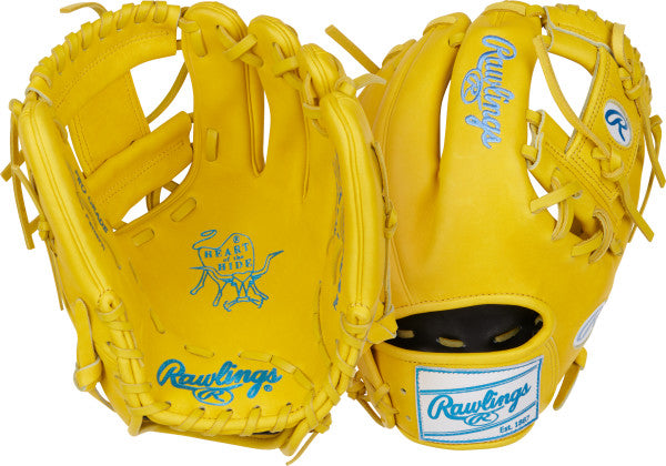 Add some pop to your game with this 11.5-inch Rawlings Heart of the Hide Colorsync infield glove! This vibrant glove adds a bright all-yellow leather color to your game by throwing in small blue features to make this glove truly stand out. Not to mention its matching shiny, blue foil stamp and blue and white Rawlings patch that further separates it from your typical ball glove. As for the specs, this glove features an 11.5-inch, Pro-I web that fits perfectly with its 204 pattern, our most popular pro infield pattern that gives infielders a deep pocket for smooth transition while maintain fast hands. On top of that, this R2G gloves uses our world-renowned Heart of the Hide leather that comes with an additional factory break-in, so you can take your new glove straight to the field! Grab your Rawlings 11.5-inch Rawlings Heart of the Hide Colorsync infield glove today!