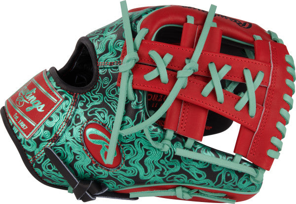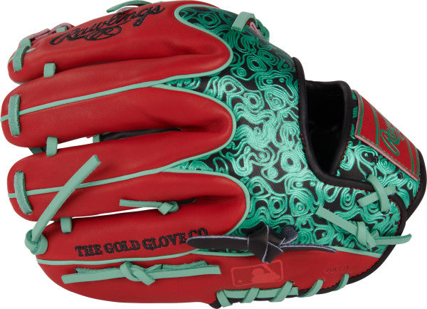 This 11.5-inch Rawlings Heart of the Hide Colorsync infield glove is a must-have for elite infielders and glove collectors alike. Right off the bat you will notice this gloves stunning mint geoprint pattern on top of its black leather. Additionally, this glove includes many red accents that pairs well with its red leather trim. To top it off, we slapped on a unique leather, red and mint Rawlings patch that will have you glowing on the field. As for the specs, this glove features an 11.5-inch, split-single post-web that goes perfectly with its 204 pattern, our most popular pro infield pattern that gives infielders a deep pocket for smooth transition while maintain fast hands. On top of that, this R2G gloves uses our world-renowned Heart of the Hide leather that comes with an additional factory break-in, so you can take your new glove straight to the field! Grab your Rawlings 11.5-inch Rawlings Heart of the Hide Colorsync infield glove today!