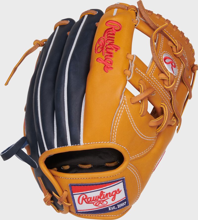 This Rawlings 11.5-inch Heart of the Hide infield glove has a traditional feel with updated features to give it a renovated look. The glove sports a navy and tan leather shell, featuring a red, white, and blue Rawlings patch!