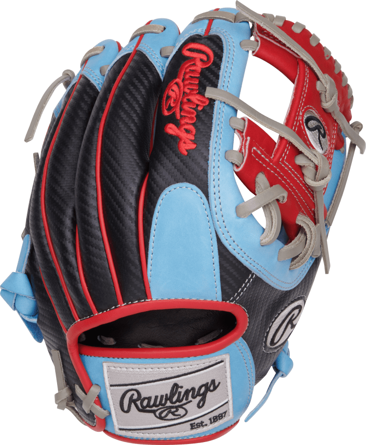 Get a hold of this Rawlings 11.5-inch Heart of the Hide infield glove that has numerous features begging to be shown off in game! The columbia blue leather is paired with a scarlet red web, binding, and stamping to create an irresistible combo. Not to mention the black hypershell that helps provide a 15% lighter fielding experience -- and looks great with the rest of the features! The Pro-I web and 200 pattern on this infield glove is a popular choice amongst many professional players, displaying its superior performance and ability on the field. The ultra-premium, world-renowned Heart of the Hide leather will give you pro-level glove performance that can last for years. Grab your Rawlings 11.5-inch Heart of the Hide infield glove today!