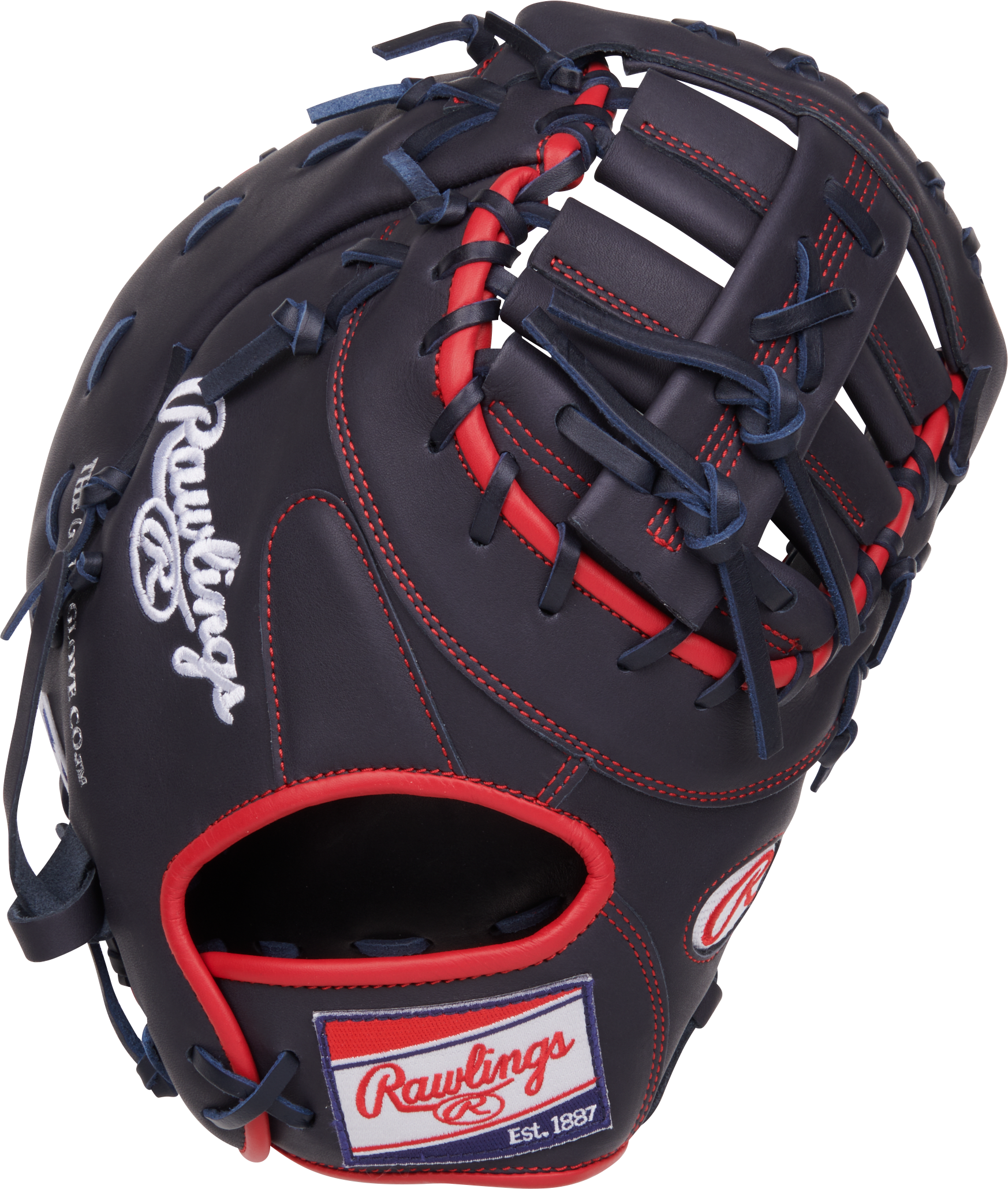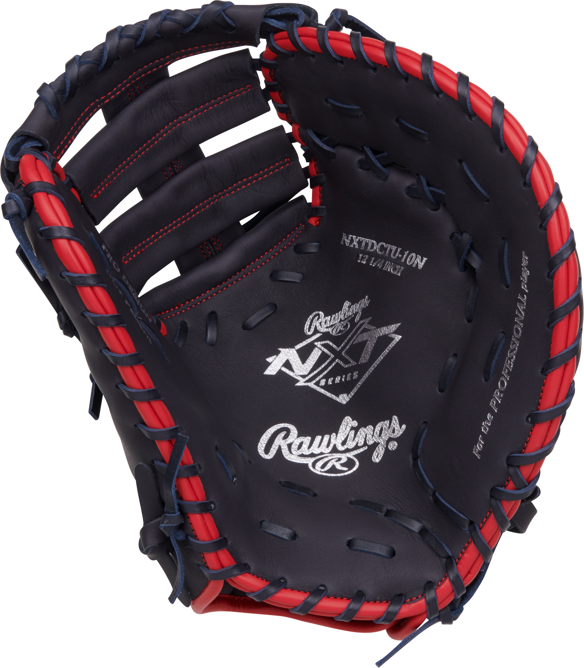 Pick everything headed your way with the Rawlings NXT ContoUR 12.25-inch first base mitt. We designed and crafted this series for the typical travel ball player, as it features high-quality leather, making it easier to break in and shape the way you need it to! This 12.25-in first base mitt sports a single-post double-bar web, allowing you to scoop with ease while offering a deep pocket to grasp any ball firmly. For added comfort of the mitt, this entire collection reps the ContoUR fit, giving players with thinner hands a more secure fit. Additionally, there are padded thumb sleeves, which help eliminate any sting you may have headed your way. The colorway on this NXT first base mitt features an all-American look with a navy color and a red, white, and blue Rawlings patch. Don't miss out on your chance to bring some swagger to the field, thanks to the NXT series offering pro-style patterns, pro-web designs, and new colorways! Grab your Rawlings NXT ContoUR 12.25-inch first base mitt today
