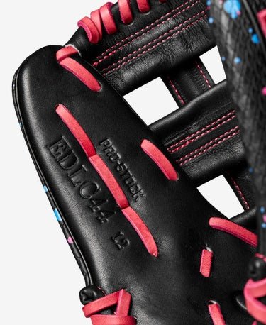 Bring the energy to the infield like Cincinnati superstar Elly De La Cruz with his Fall 2024 A2000® EDLC44, the 12” Game Model baseball glove he prefers at shortstop and third base. Equipped with Black SuperSnakeSkin™ coated in Pink and Blue accents, Elly’s infield glove delivers lightweight performance while repelling moisture from rain or wet grass. The 12” reach and sturdy Dual Post Web makes it easy to extend for balls in the hole or hot shots down the line. Elly’s signature is stamped in the Black Pro Stock® leather palm, and gradient logos in Pink & Blue bring more juice to match the infielder’s swagger.