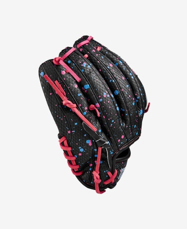 Elly De La Cruz’s 12” infield baseball glove with Pink & Blue Splatter Paint SuperSnakeSkin™ for lightweight performance.