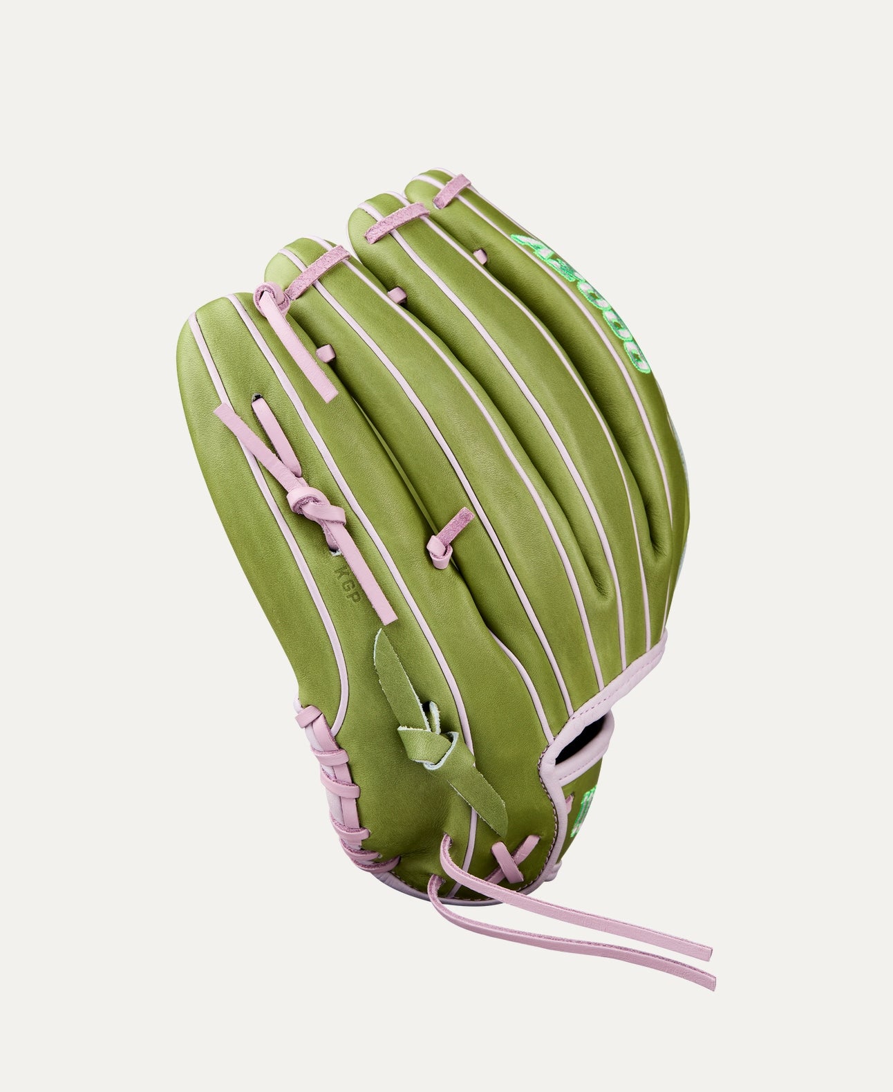 Keep hitters guessing while you deal your best stuff from the circle with the Fall 2025 A2000® MA14, a 12.25” fastpitch softball glove inspired by Monica Abbott’s favorite A2000. This glove’s full Military Green & Lavender Pro Stock® leather construction offers lasting comfort and performance, and its Closed Two-Piece Web conceals your pitch grips so you can deliver your best rise ball, changeup or drop ball without missing a beat. Players can adjust the drawstring wrist closure on the fly to ensure a secure fit on every play