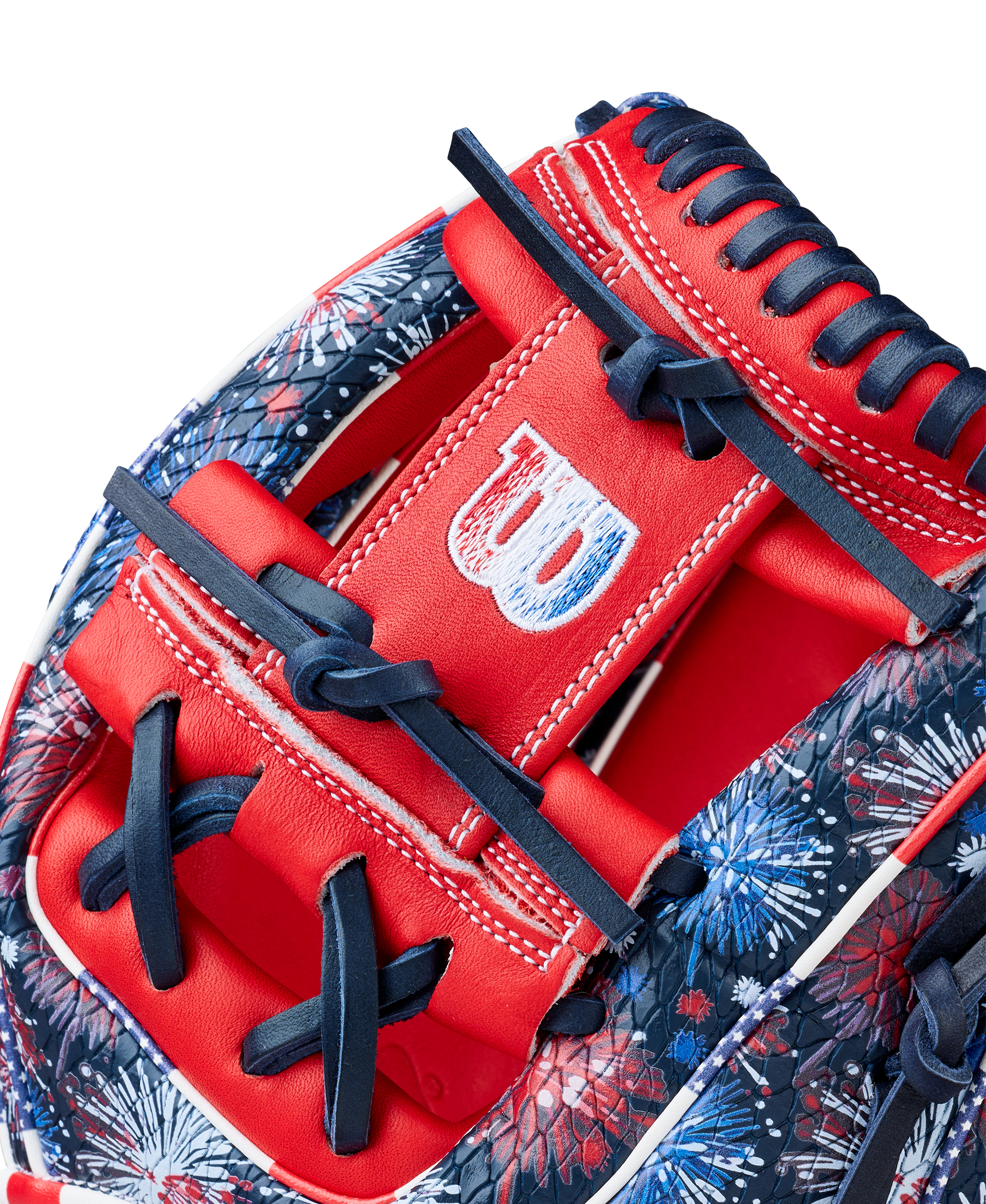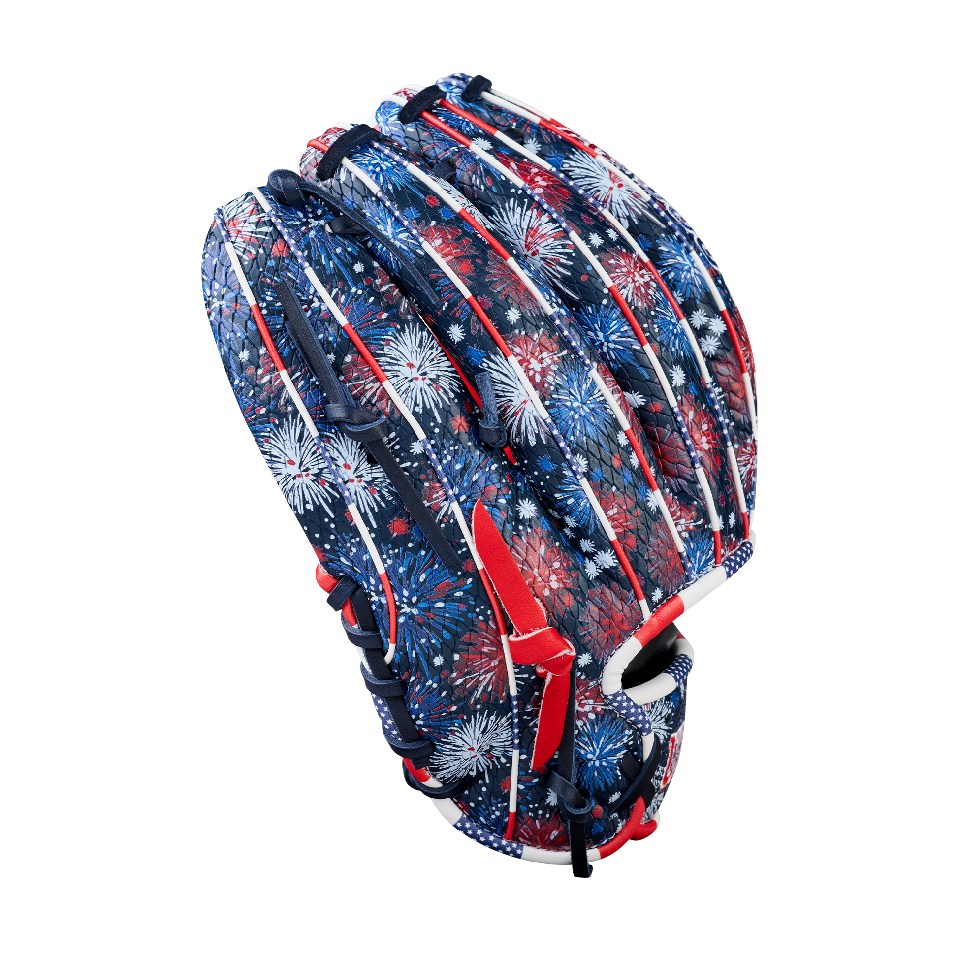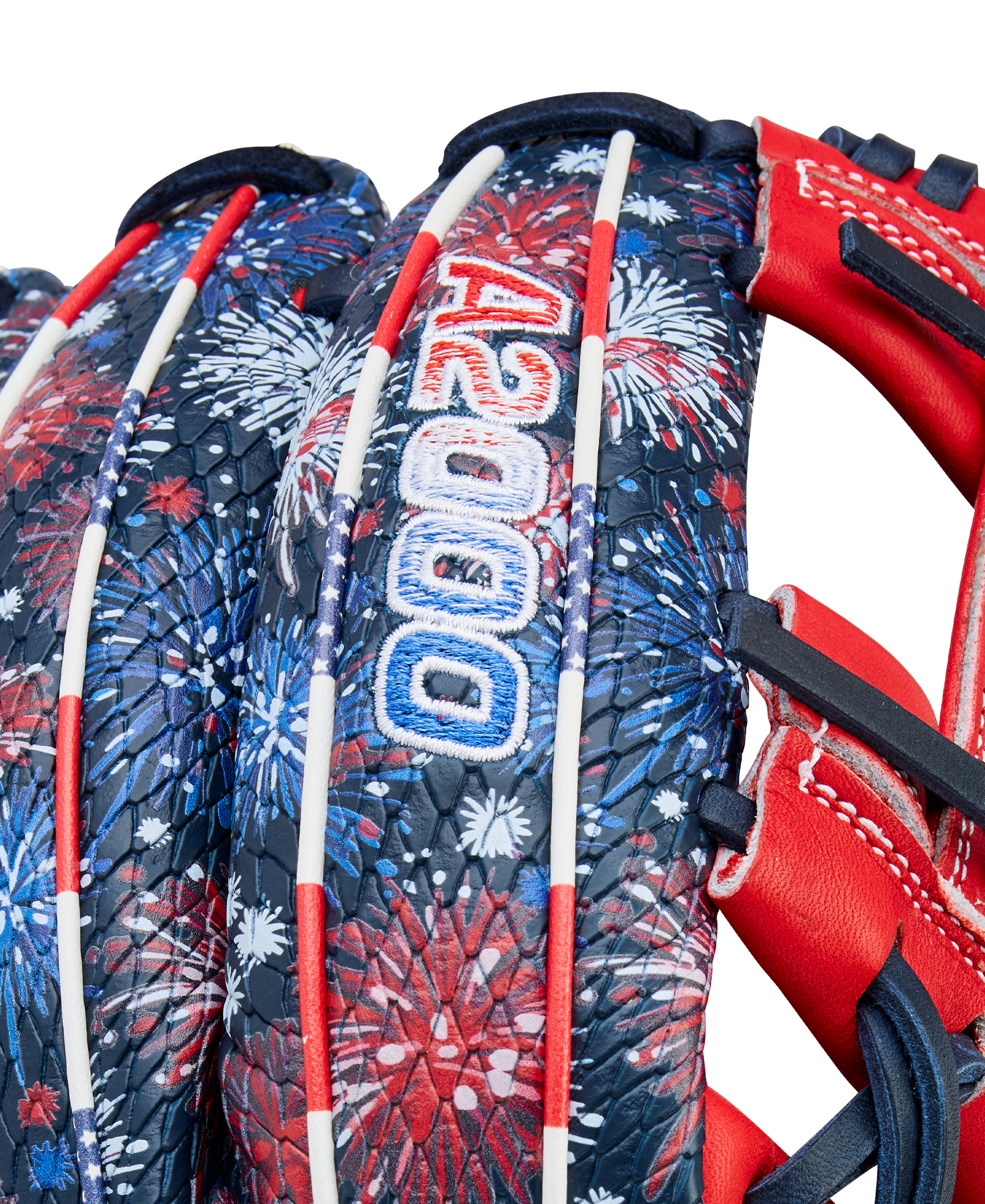 Bring the fireworks to the infield with this custom A2000 1975SS featuring Firework SuperSnakeSkin™ decorated in shades of Red, White & Blue. The 11.75” glove dazzles up the middle or down the third base line, and binding & welting mirrors the Stars & Stripes.