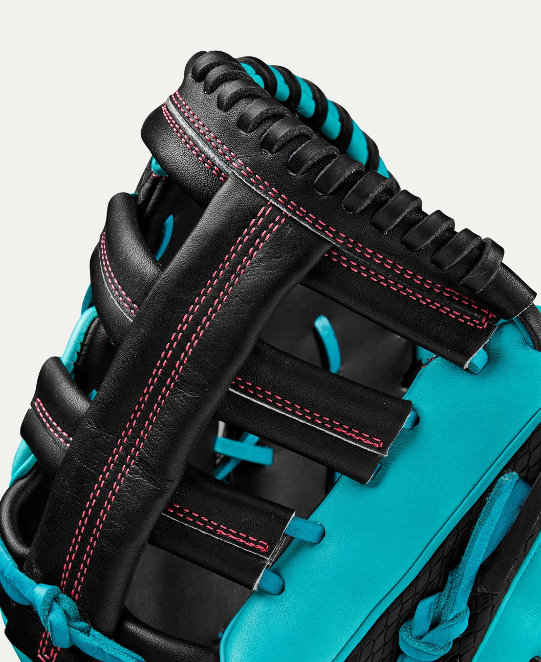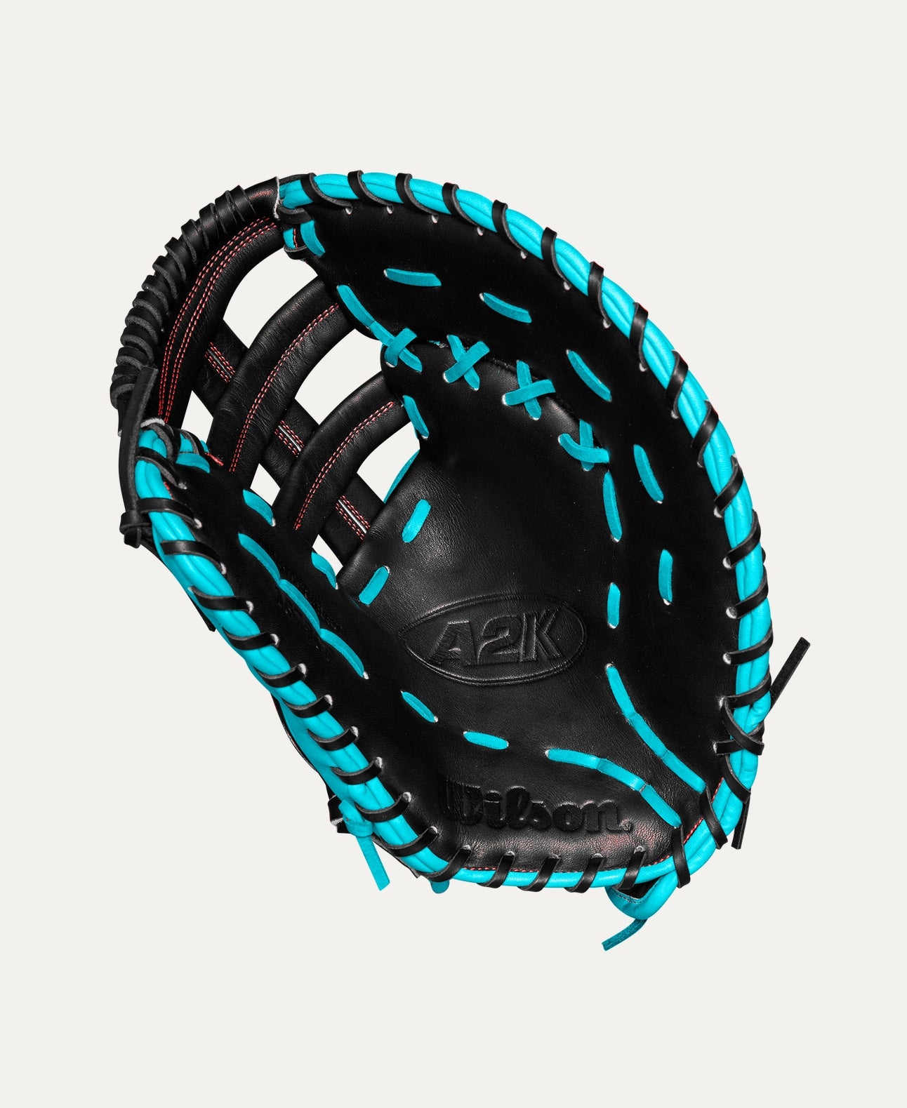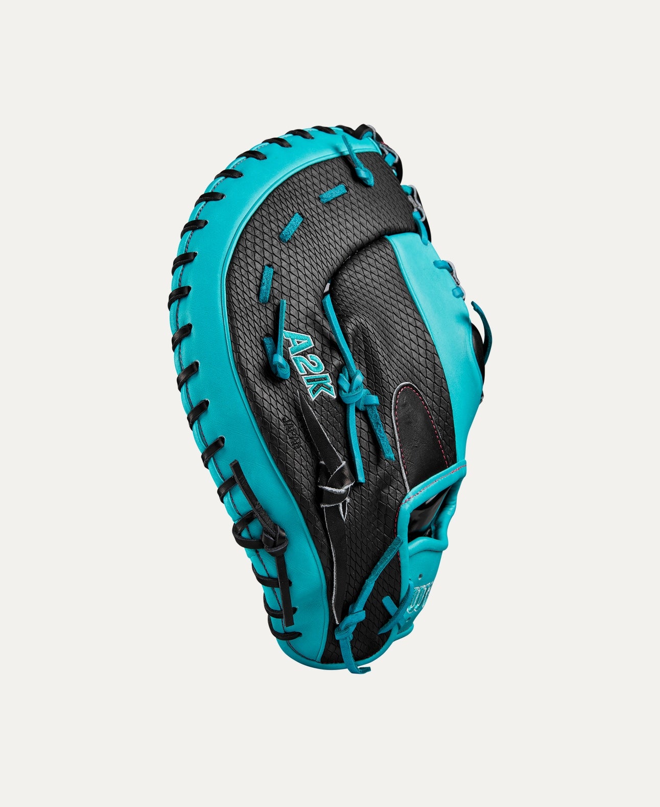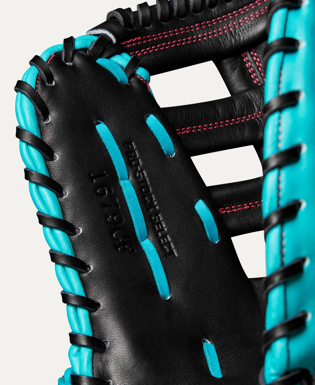 Scoop any throw with the Spring 2025 A2K® 1679SS, a 12.5” first base mitt optimized to handle like an infield glove while working around the bag. The modified wrist strap allows players to comfortably shift their fingers in the mitt for improved control, and welting reinforces the mitt along the pinky side and thumb side. A Single Post Web and single break point design make it easy to handle ground balls and pop-ups on the right side of the infield, and expert Teal and Black Pro Stock® Select leather pairs with Black SuperSnakeSkin™ for a flawless look and feel