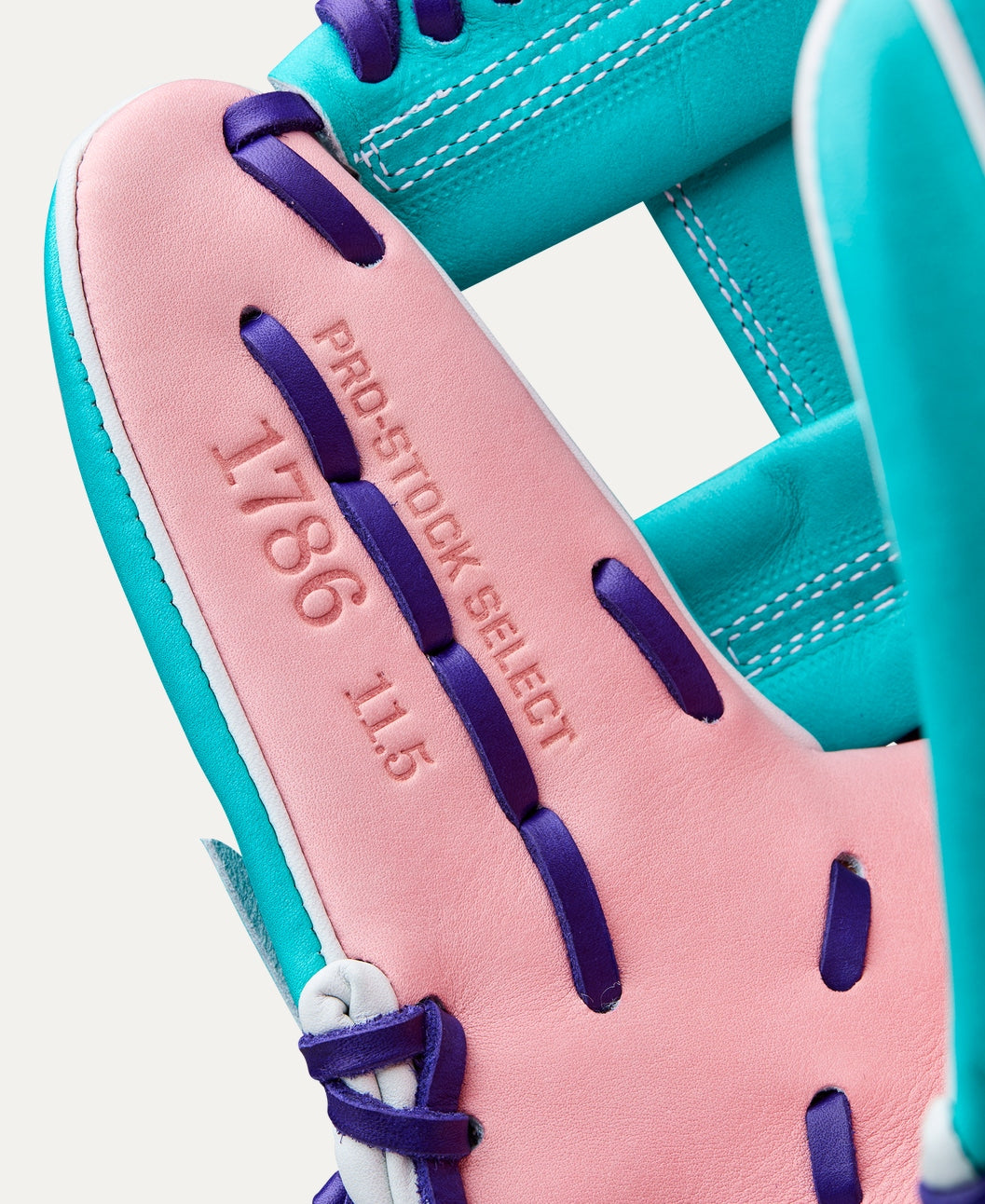 Turn quick double plays up the middle or corral hard hit balls down the third base line with the Winter 2025 A2K® 1786, Wilson’s iconic infield glove pattern that leverages a shallow pocket design, H-Web construction and 11.5” reach for total control and fast transfers. Expert glove craftsmen in Japan assemble the A2K® 1786 with flawless Pink and Teal Pro Stock® Select leather for a warm appearance and elite performance. Double Palm Construction – an extra layer of leather between the palm shell and liner – forms to your hand during the break-in process and holds its shape over time.